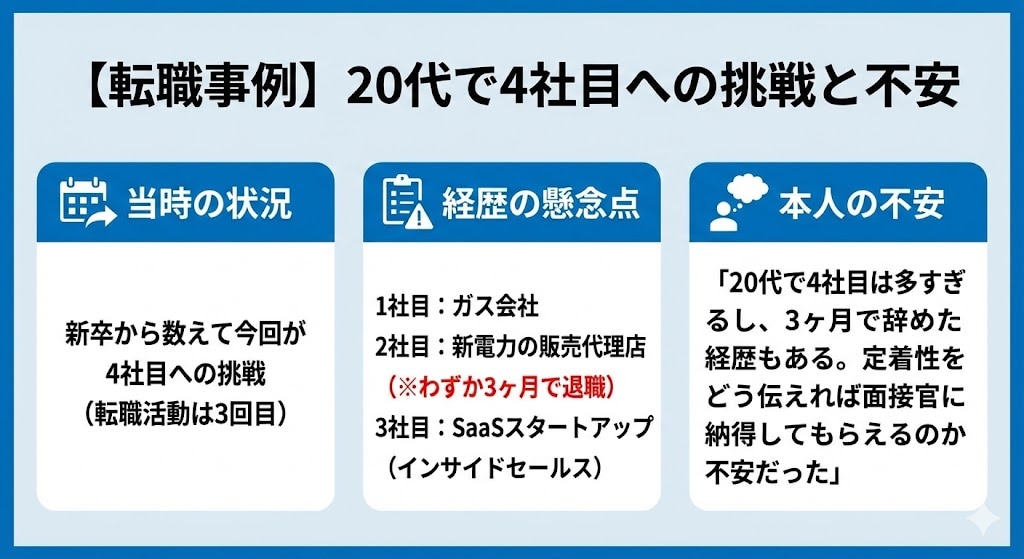 特に営業職の場合、何を売ってきたか以上にどのように売ってきたか(プロセス)を言語化できれば、転職回数や在籍期間の短さは致命傷にはなりません。