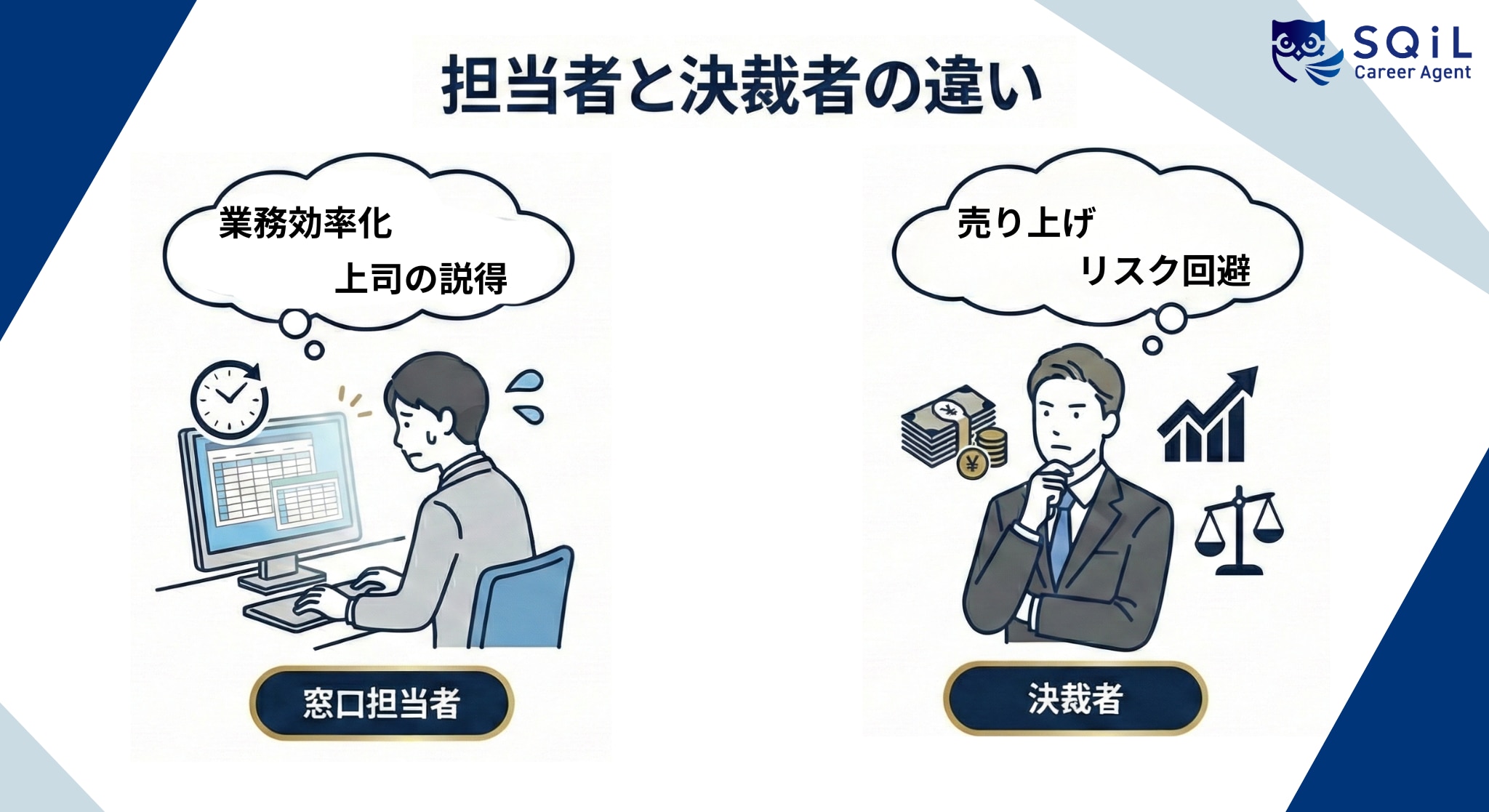 法人営業が個人営業と決定的に違う点は、「目の前の相手(担当者)」と「決定権を持つ相手(決裁者)」が異なるという点です。