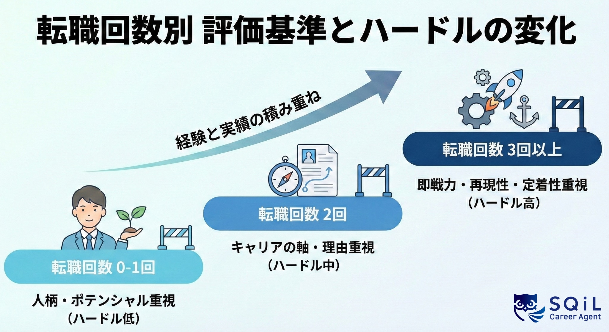 つまり、転職回数が多くても「転職の理由→身に付いたスキル→次の職場でどう活かすか」の流れに一貫性があり、論理的に説明できるかどうかでマイナスにもプラスにも働きます。